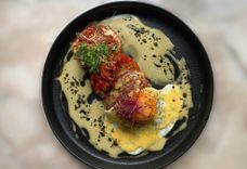 Рубленая котлета с глазуньей под голландским соусом, бакинскими томатами и соусом Аррабиата